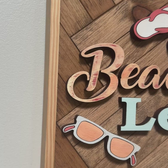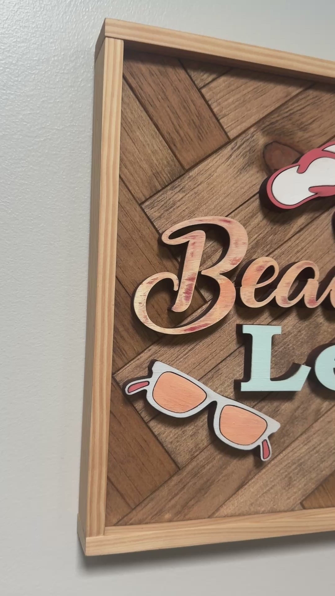 This unique piece features a striking herringbone backer, laser cut from real pine wood and finished with a warm Early American stain. The playful message is crafted from 1/2" solid pine letters and beach-themed graphics, all hand painted to add dimension, character, and charm. With flip-flops, sunglasses, and pickleball paddles, it's the perfect blend of beach life and sport.