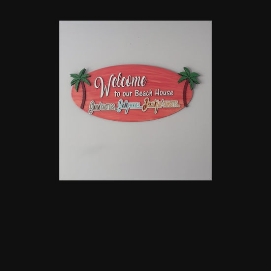 "Welcome to Our Beach House" – Hand Painted Surfboard-Style Wall Sign (25" x 12")